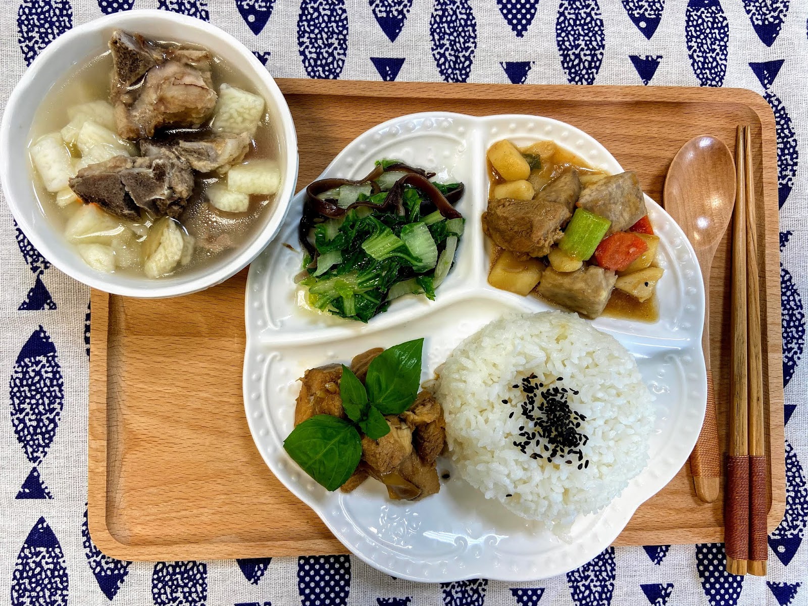 素:糙米飯+香酥番薯片+和風關東煮+枸杞高麗菜+朴菜筍片湯